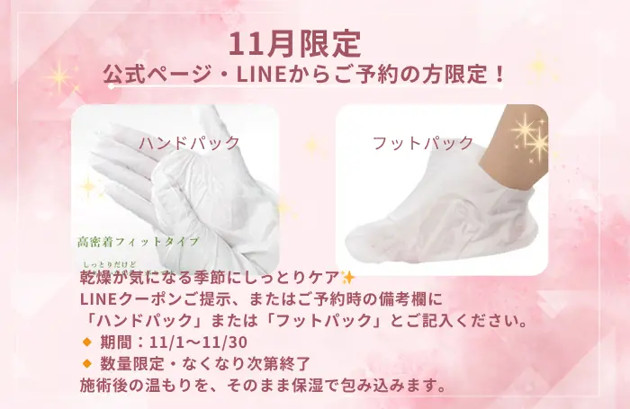 🔸「LINEクーポンご提示」またはご予約時の備考欄に「ハンドパック」または「フットパック」とご記入ください。