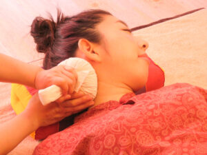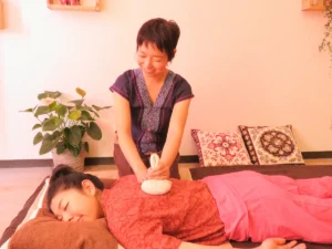 ハーブのエネルギーをぎゅっと詰めたボールを蒸して温め、エネルギーライン「SEN(セン)」に沿って「ポンポンポン」と体にあてていきます。タイ古式と温熱の相乗効果で、冷えやすい骨盤まわりやポンプ役のふくらはぎをしっかりケアし、女性の体を内側からサポートします。