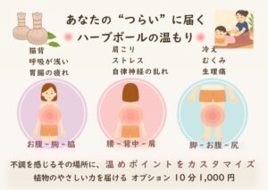 施術で使用したハーブボールは、電子レンジで温めてセルフケアができます。