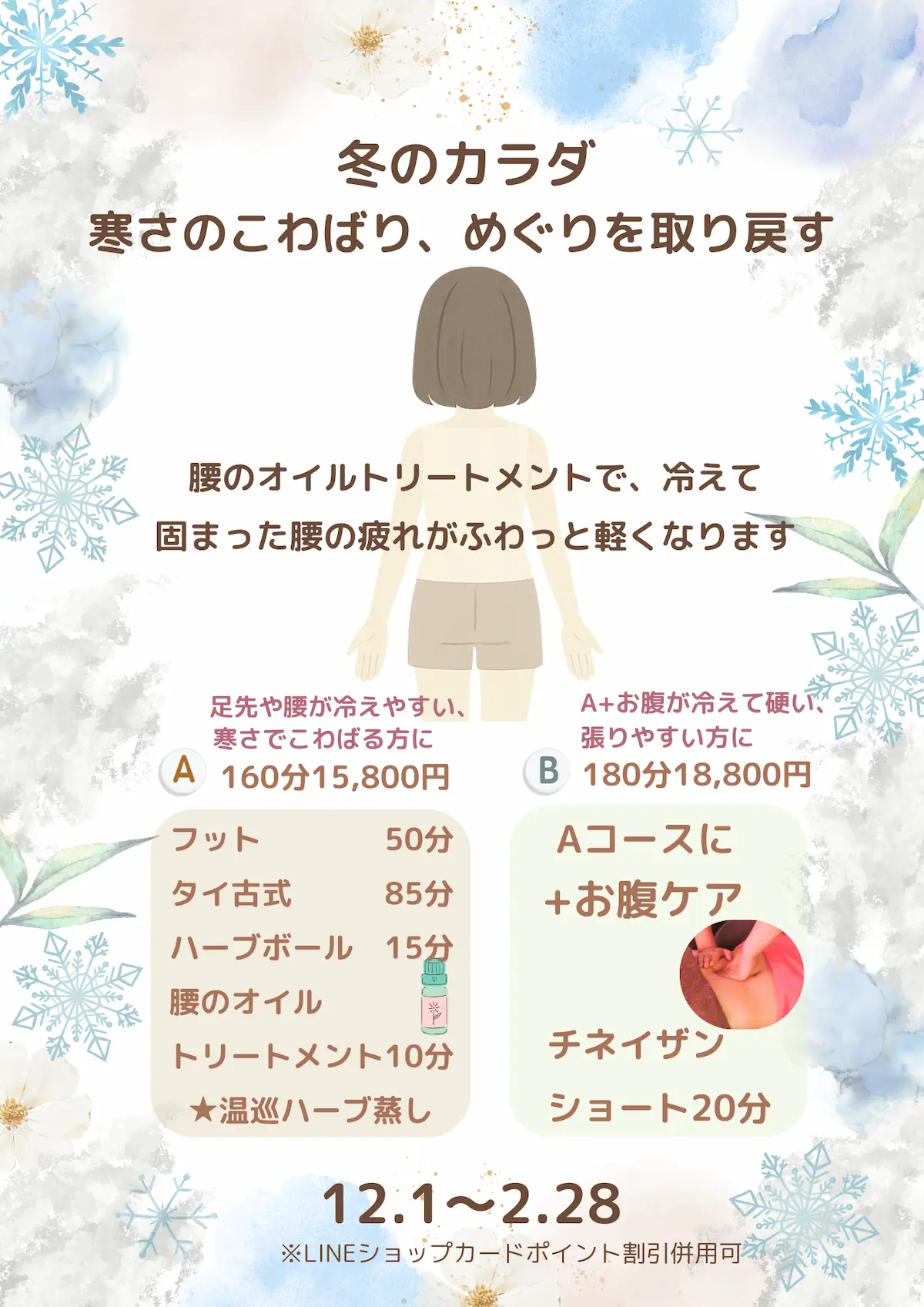 冬は、気持ちや体がぎゅっと縮まりやすい季節。冷えが溜まると、筋肉が固くなったり、血のめぐりが滞りやすくなります。腰のオイルトリートメントをプラスした期間限定の特別プランです!