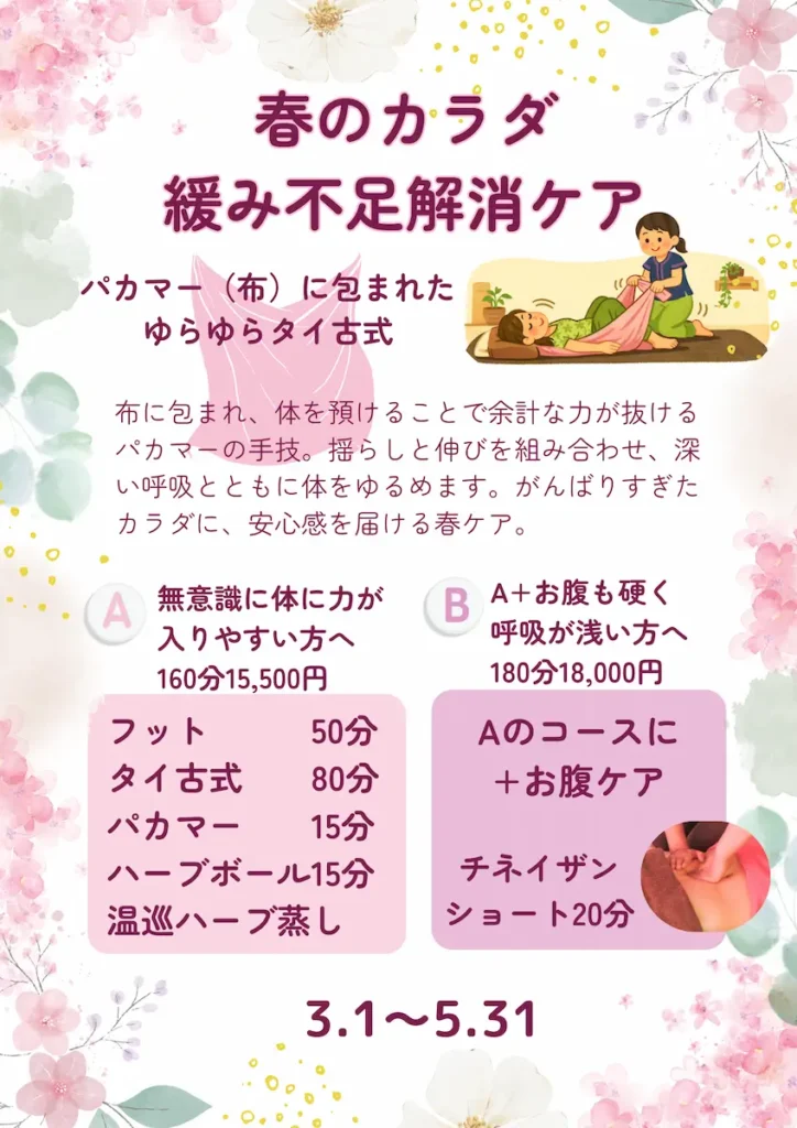春のリセットケア160分・180分 キャンペーン 2026.02.26 春のリセットケア160分・180分 期間限定:3/1~5/31 春って気持ちは前向きなのに、体はなんだかついてこない…そんな感覚、ありませんか? 朝晩は冷えるのに、昼間はポカポカ。この寒暖差に、体がついていかない方も多い時期。体を春に慣らしていきませんか?