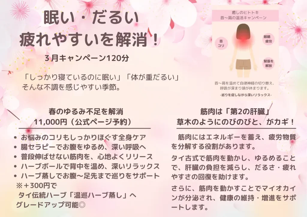 3月”季節のキャンペーン”「眠い・だるい・疲れやすいを解消!」タイ古式120分 キャンペーン 2026.02.152026.02.26 「しっかり寝ているのに眠い」「体が重だるい」そんな不調を感じやすい季節。春は草木のようにのびのびと!タイ古式120分のお知らせ