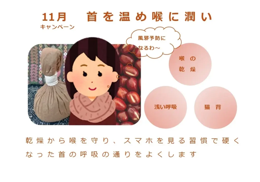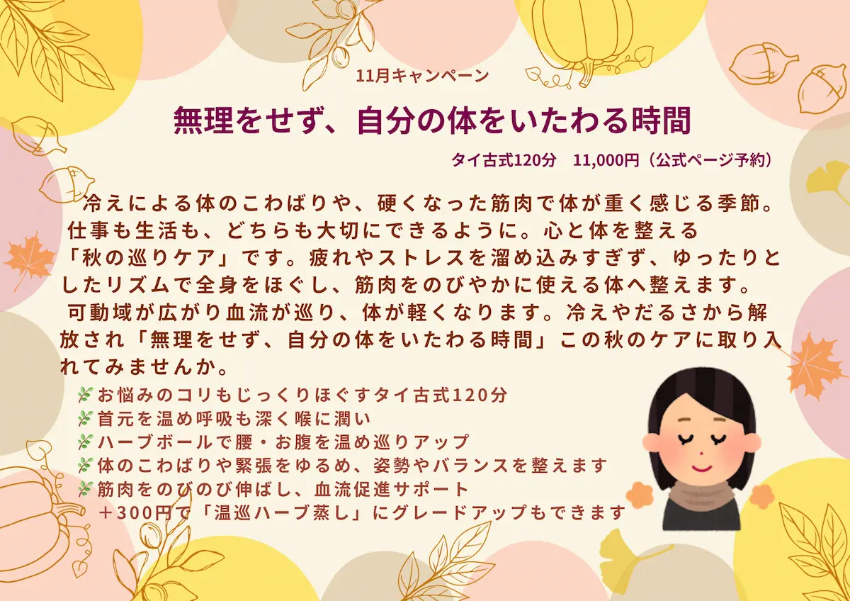 首元をハーブで温めながら、体のこわばりを温活ケア!仕事も生活も、どちらも大切にできるように心と体を整える「秋の巡りケア」です。疲れやストレスを溜め込みすぎず、ゆったりとしたリズムで全身をほぐし、筋肉をのびやかに使える体へ整えます。可動域が広がり血流が巡り、体が軽くなります。冷えやだるさから解放され「無理をせず、自分の体をいたわる時間」この秋のケアに取り入れてみませんか。